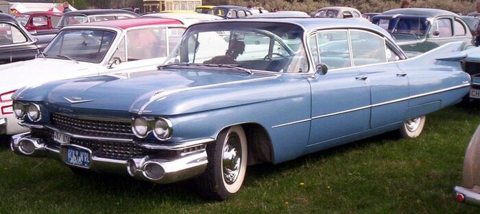The 1959 Cadillac is remembered for its huge sharp tailfins with dual bullet tail lights, two distinctive rooflines and roof pillar configurations, new jewel-like grille patterns and matching deck lid beauty panels.